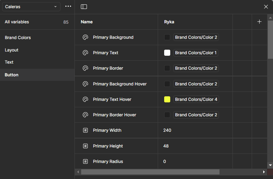 Figma released their Variables Library tool just in time for this project. I created a single library for Caleres and filled in a mode for each of the nine child brands using their unique colors, buttons, typography, and styling.